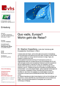 Am 19. Juni 2012 findet ab 19:30 Uhr in der Mensa der Altkönigschule in Kronberg/Taunus ein Vortrag mit dem Leiter der regionalen Vertretung der EU-Kommission, Dr. Stephan Koppelberg, statt. Sein Thema ist "Quo vadis, Europa? Wohin geht die Reise?". » weiterlesen