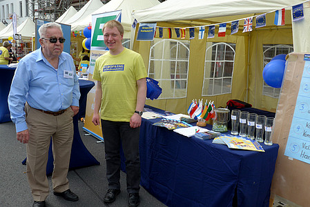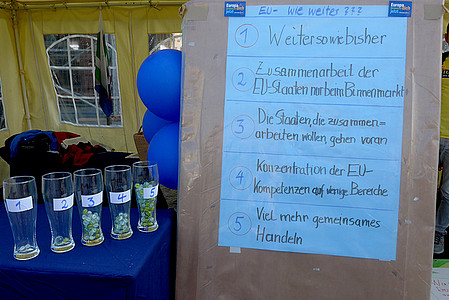 Die Europa-Union feierte wie immer mit und bot neben Informationen und einem Europa-Quiz auch eine Umfrage zur Zukunft Europas an, die viele Besucherinnen und Besucher anzog. Die Umfrage orientierte sich an den fünf Szenarien, die vor kurzem EU-Kommissionspräsident Jean-Claude Juncker vorgelegt hatte, um die 27 Staaten dazu zu bringen, ihre Vorstellungen zur Zukunft der EU bekannt zu geben. Das Ergebnis war, vielleicht auch aufgrund der guten Stimmung an diesem sonnigen Tag in der Kreishauptstadt, dass 30 % für eine Vertiefung der EU waren. An zweiter Stelle mit 21 % lagen diejenigen Teilnehmer und Teilnehmerinnen, die für das Vorangehen derjenigen Länder in der EU gestimmt hatten, die schneller weiterkommen wollten. Allerdings ohne die Staaten auszuschließen, die dann zu einem späteren Zeitpunkt nachrücken wollten.