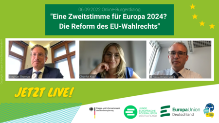 Die Aufzeichnung des Online-Bürgerdialogs "Eine Zweitstimme für Europa 2024? Die Reform des EU-Wahlrechts" vom 6. September 2022 ist hier abrufbar.