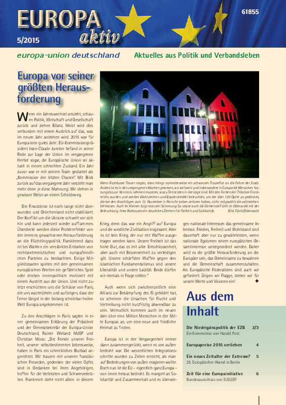 in der jüngsten Ausgabe unserer Mitgliederzeitschrift geht es um die aktuelle Bewährungsprobe der Europäischen Union, das Aufflammen des Extremismus, die europäische Flüchtlingspolitik und die Zinspolitik der Europäischen Zentralbank. Erfahren Sie außerdem mehr von den Forderungen und Aktivitäten der Europa-Union und ihres Jungendverbandes JEF. Wie immer gibt es auch viel Neues aus den Landes- und Kreisverbänden.