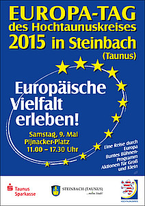 Europa-Tag in Steinbach: ein buntes, fröhliches Open-Air-Fest am Samstag, 9. Mai 2015 auf dem Pijnackerplatz mit einem Unterhaltungsprogramm und viel Information zum Thema Europa. Unter dem Motto "Europäische Vielfalt erleben!"finden Besucher und Besucherinnen dort alle 13 Kommunen des Hochtaunuskreises mit ihren europäischen Partnern. Die Europa-Union ist mit einem Quiz dabei und lädt die Gewinner zu einer zweitägigen Reise nach Brüssel ein. Beginn 11 Uhr.
