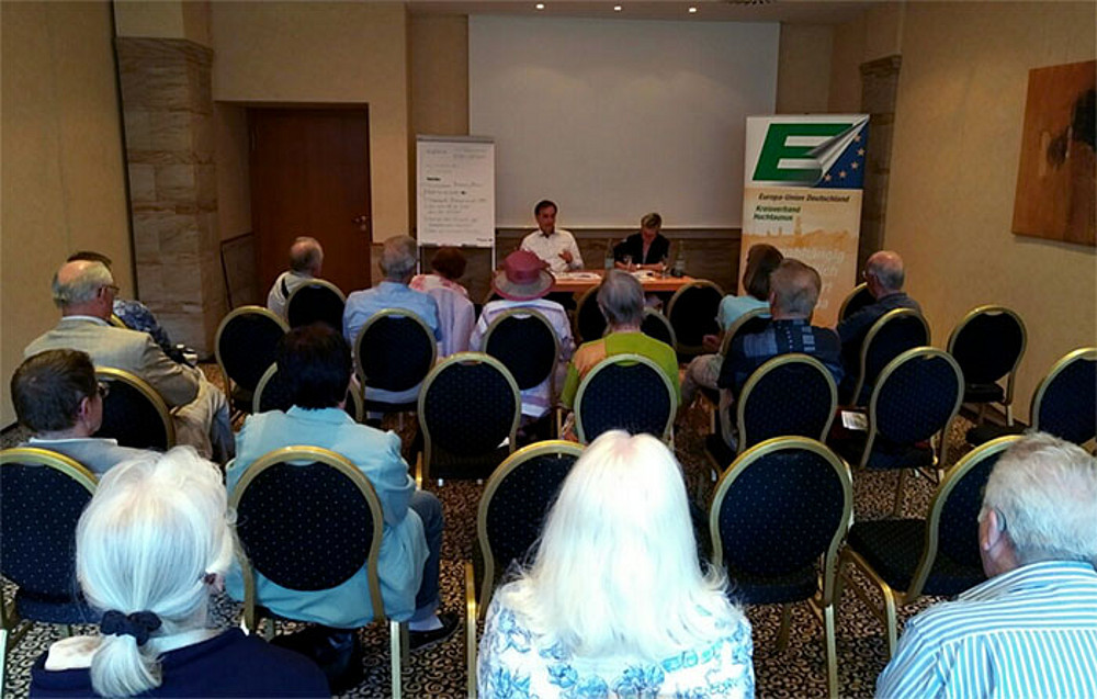 Eine lebhafte Diskussion, kritisch und auch mit Sorge um die EU, schloss sich an. Der Referent widmete sich mit viel Geduld den vielschichtigen Fragen der Anwesenden, die trotz der großen Hitze zwei Stunden lang mit Interesse dabei waren.