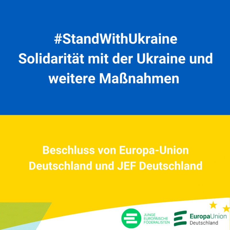 Europa-Union Deutschland und JEF Deutschland verurteilen den Angriffskrieg des russischen Präsidenten, Wladimir Putin, auf das Schärfste. Wir stehen solidarisch an der Seite der Ukraine und ihrer Bevölkerung, über die dieser Krieg unsägliches Leid bringt, sowie auch all derjenigen, die sich in Russland und Belarus für Frieden, Demokratie und Freiheit einsetzen.